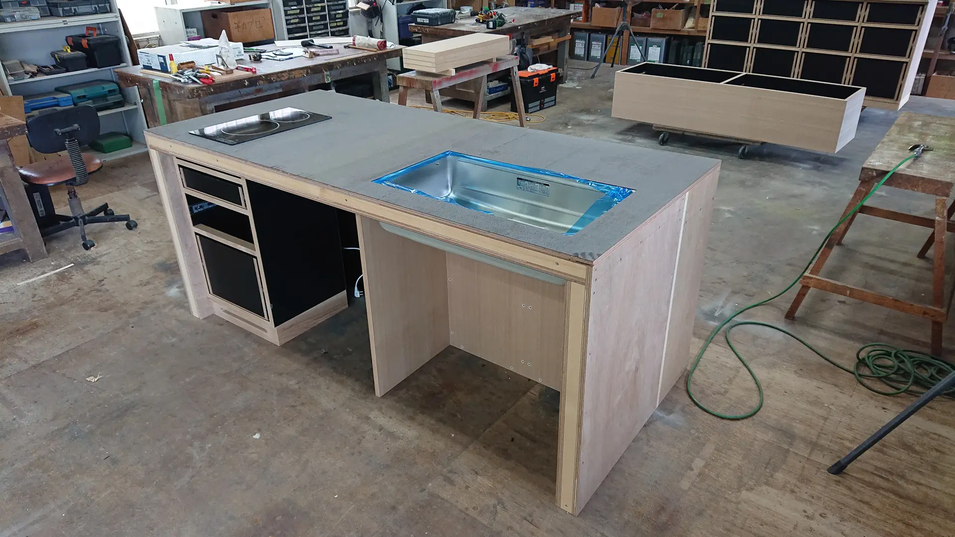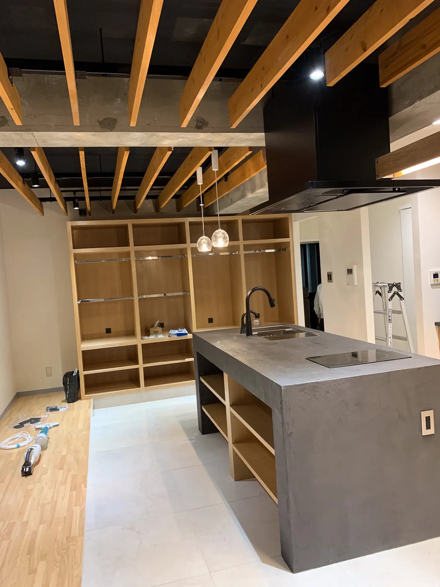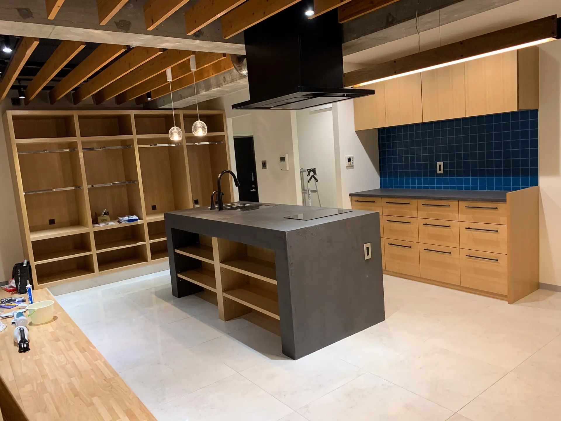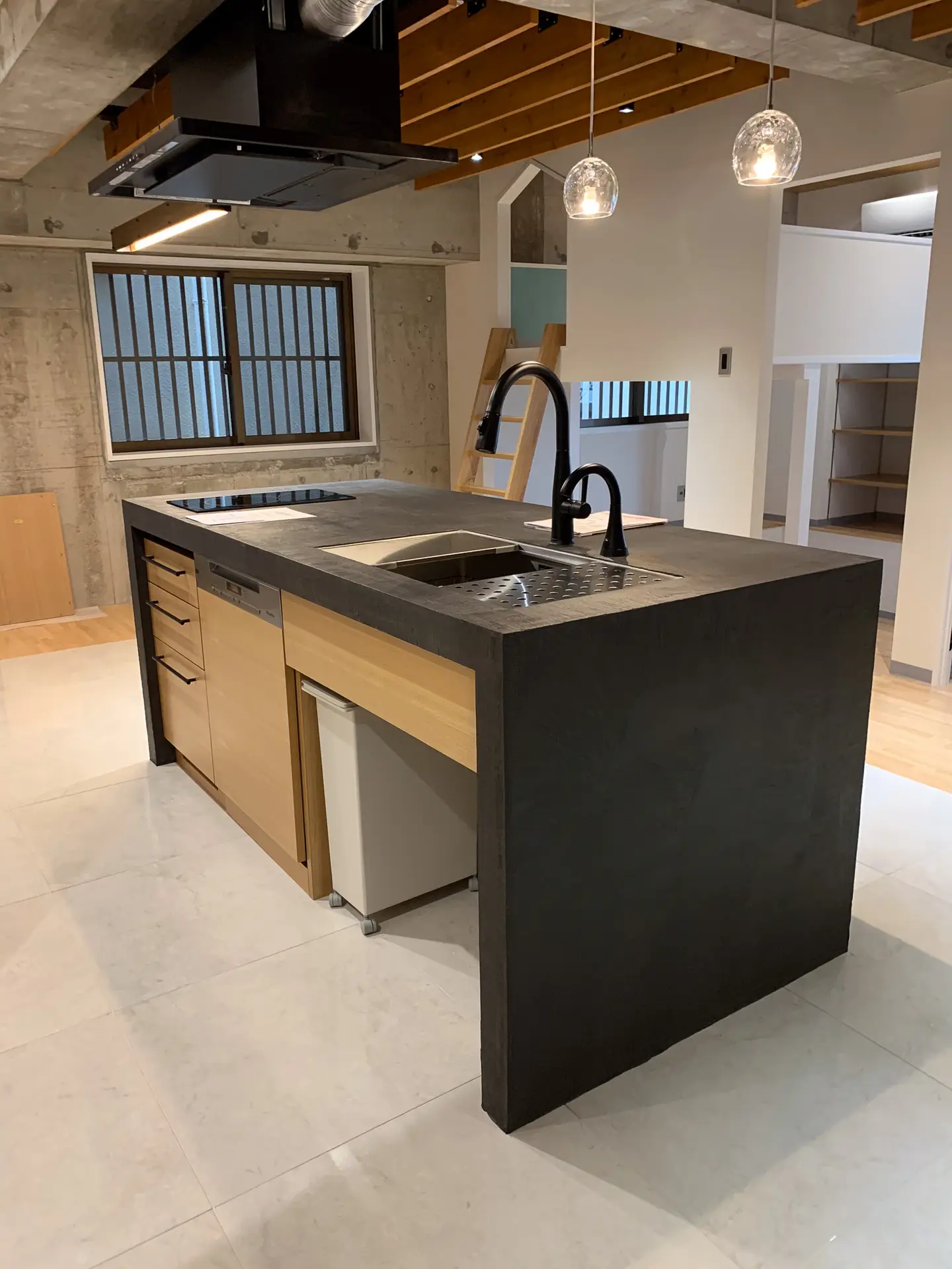 この家の核となるのは、LDKの中心に配置したキッチンです。特にこだわったのは、毎日の家事を楽にする**「スムーズな動線」**。玄関から靴のままキッチン横まで直接アクセスできるので、買い物から帰宅した際も、重い荷物を抱えたままキッチンまで運ぶことができます。